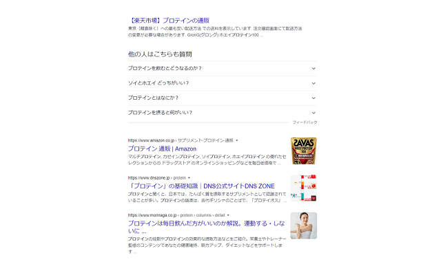 上の画像の通り「プロテイン」と検索すると、1位と2位にプロテインのサービスページが表示されていることから、多くのユーザーはプロテインを購入したいと思っていると分かる。