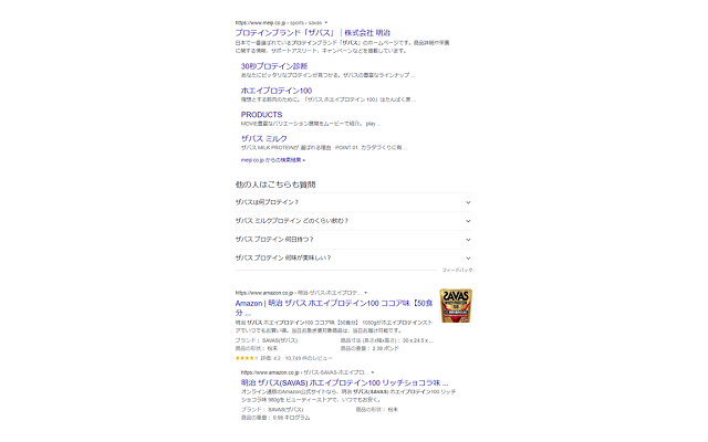 一方、「プロテイン ザバス」と検索すると、ザバスのプロテイン商品ページばかりが表示されます。