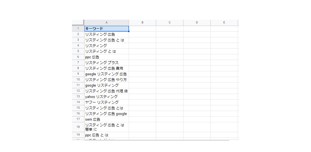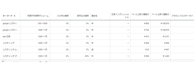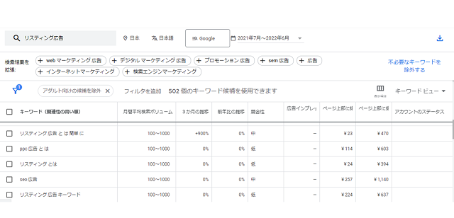 例えば、Googleキーワードプランナーで「リスティング広告」と入力すれば、関連性の高いキーワードを一括で抽出できます。