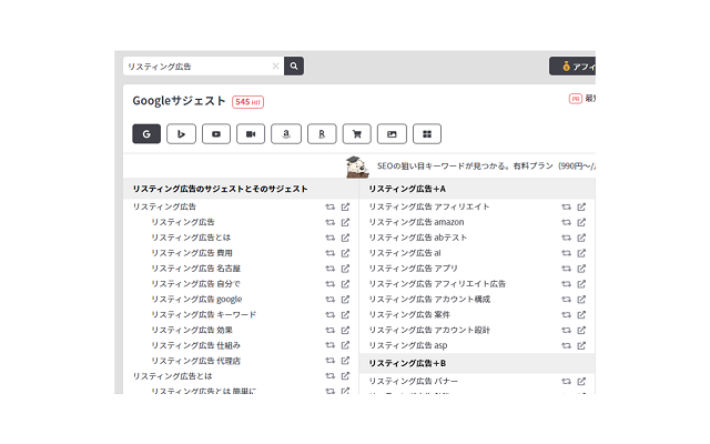 上の画像は、ラッコキーワードに「リスティング広告」と入力した場合のサジェストキーワードを示しています。Google キーワードプランナーのように、関連キーワードが一覧で表示されるため、非常に便利です。