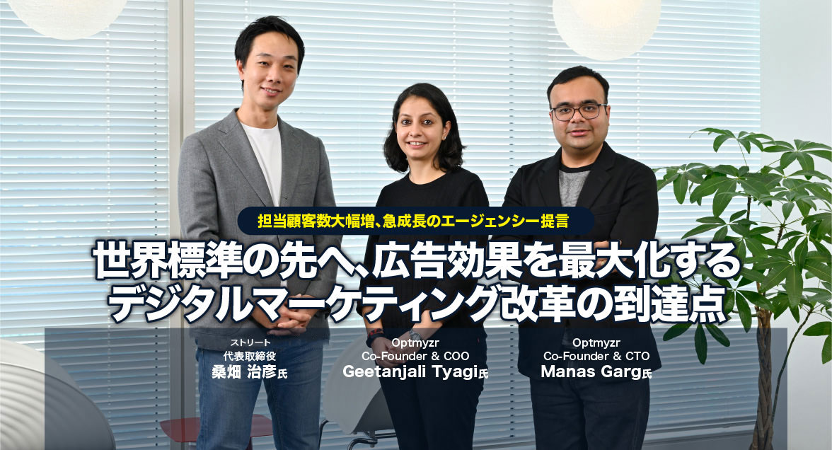 桑畑氏 Optmyzrの特筆すべきポイントは、繁盛期や閑散期など各業界のシーズナリティーや特性はもとより、企業の経営戦略に合わせて細かく調整できることです。高度な最適化や粒度の高い運用を可能にするOptmyzrと、業界の特徴を理解したストリートの専門コンサルタントを掛け合わせることで目標達成、効果の最大化を実現できます。日本企業のデジタルマーケティング改革に向けた新たな一手として、Optmyzrを通じてお客様に付加価値を提供していきます。
